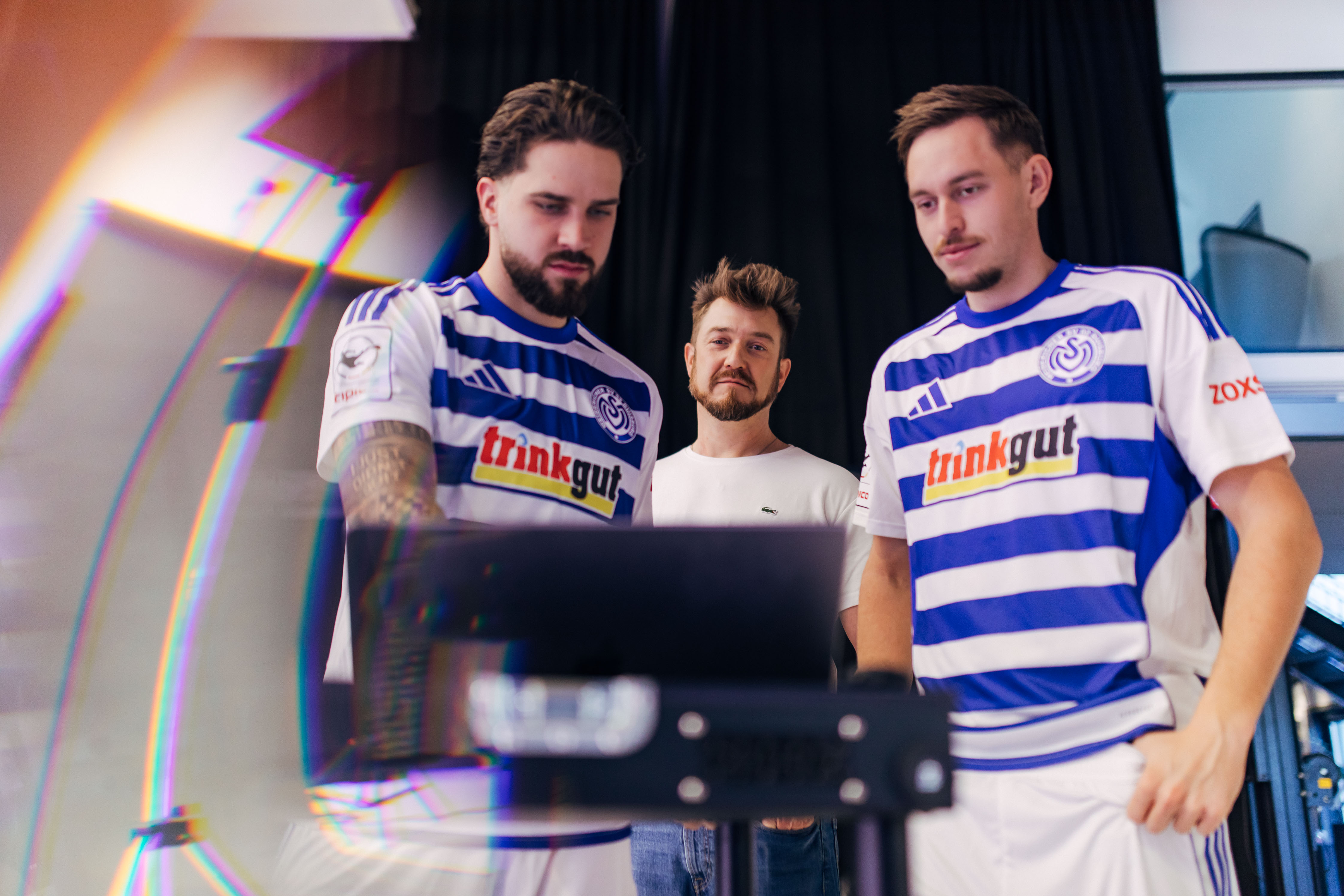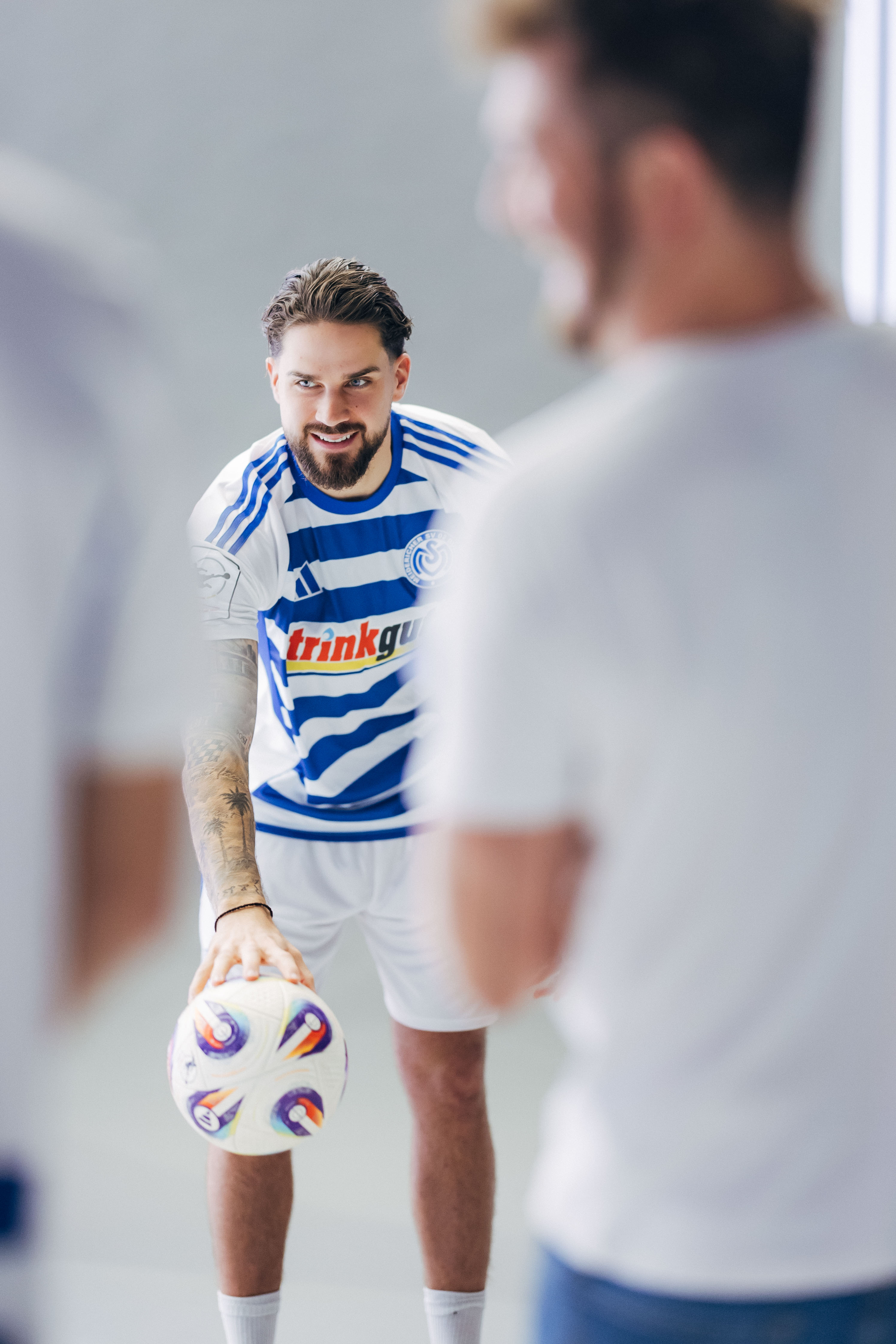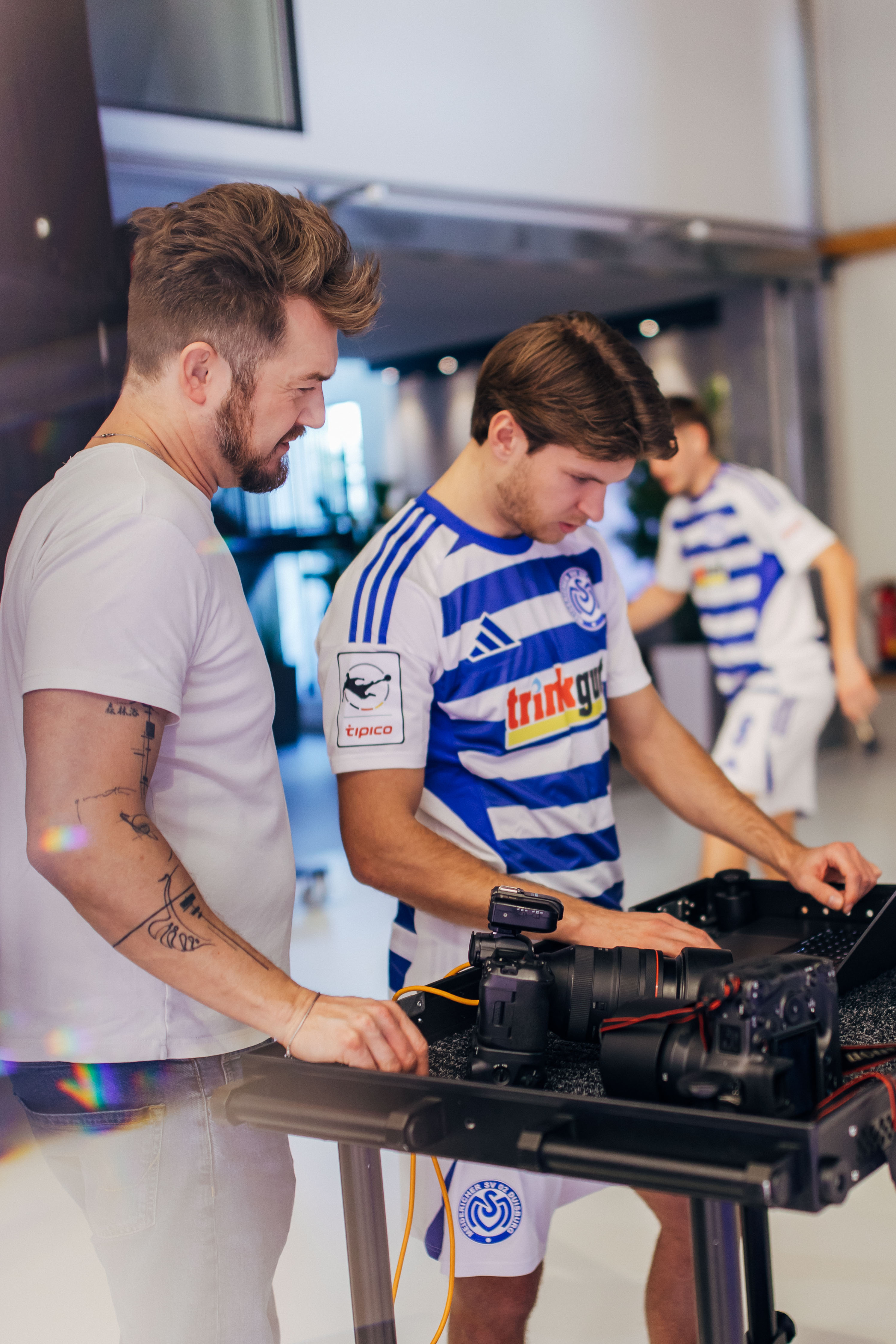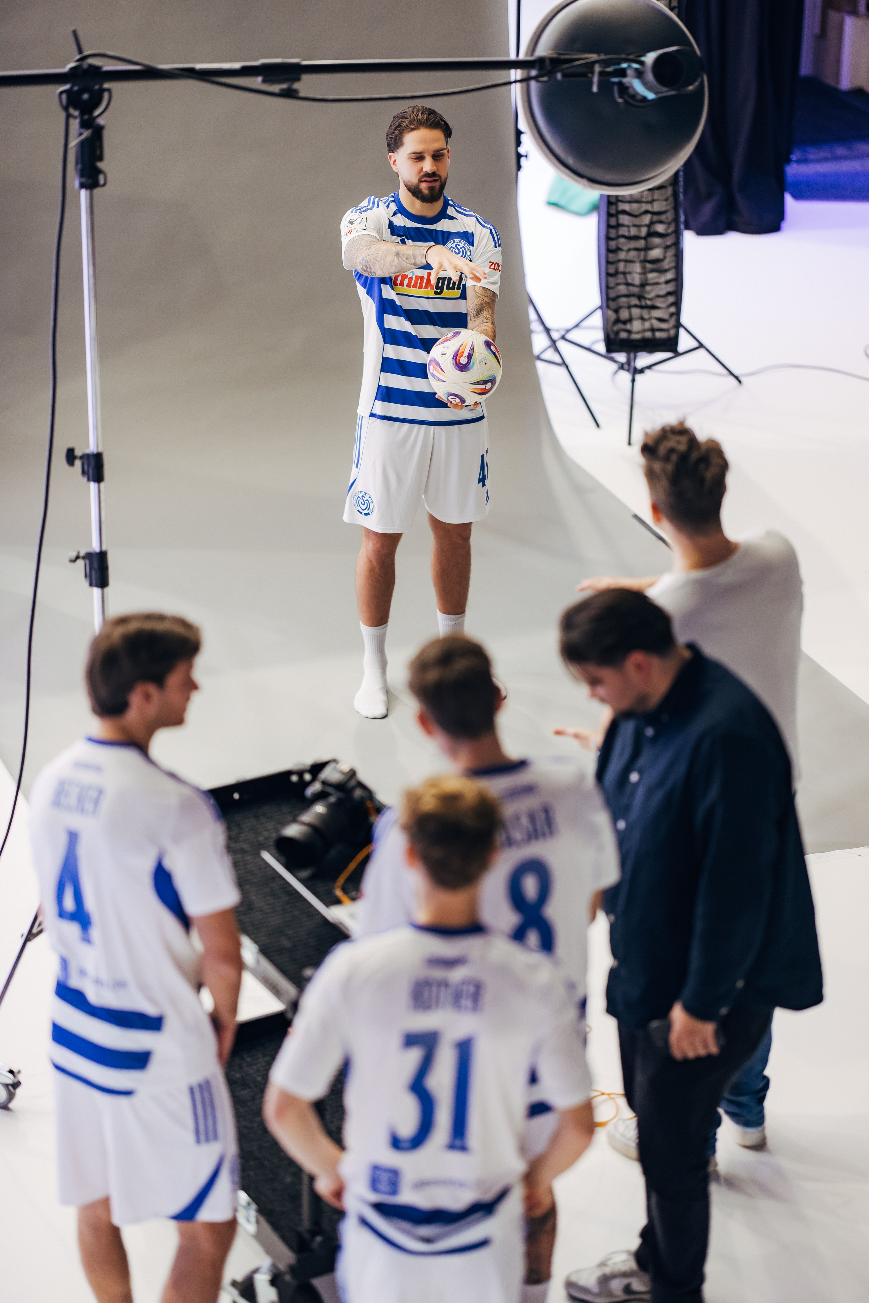Die Spieler, das Trainerteam und das Funktionsteam des MSV Duisburg sind regelmäßig bei uns zu Gast, um neues Bildmaterial zu produzieren. Jedes Mal freuen wir uns, die stets gut gelaunte Truppe in unserem Film- & Fotostudio begrüßen zu dürfen. Kürzlich brachte Luca Kratz aus dem MSV-Marketing drei neue Spieler mit, um Autogrammkarten sowie weiteren hochwertigen Content zu erstellen. Fotograf Lars David Neill setzte die Sportler mit viel Erfahrung und Feingefühl perfekt in Szene. Unser großzügiges Studio überzeugte dabei mit viel Platz, angenehmem Ambiente und entspannter Musik. Die professionellen Posen der Spieler verliehen der gesamten Produktion den letzten Schliff.